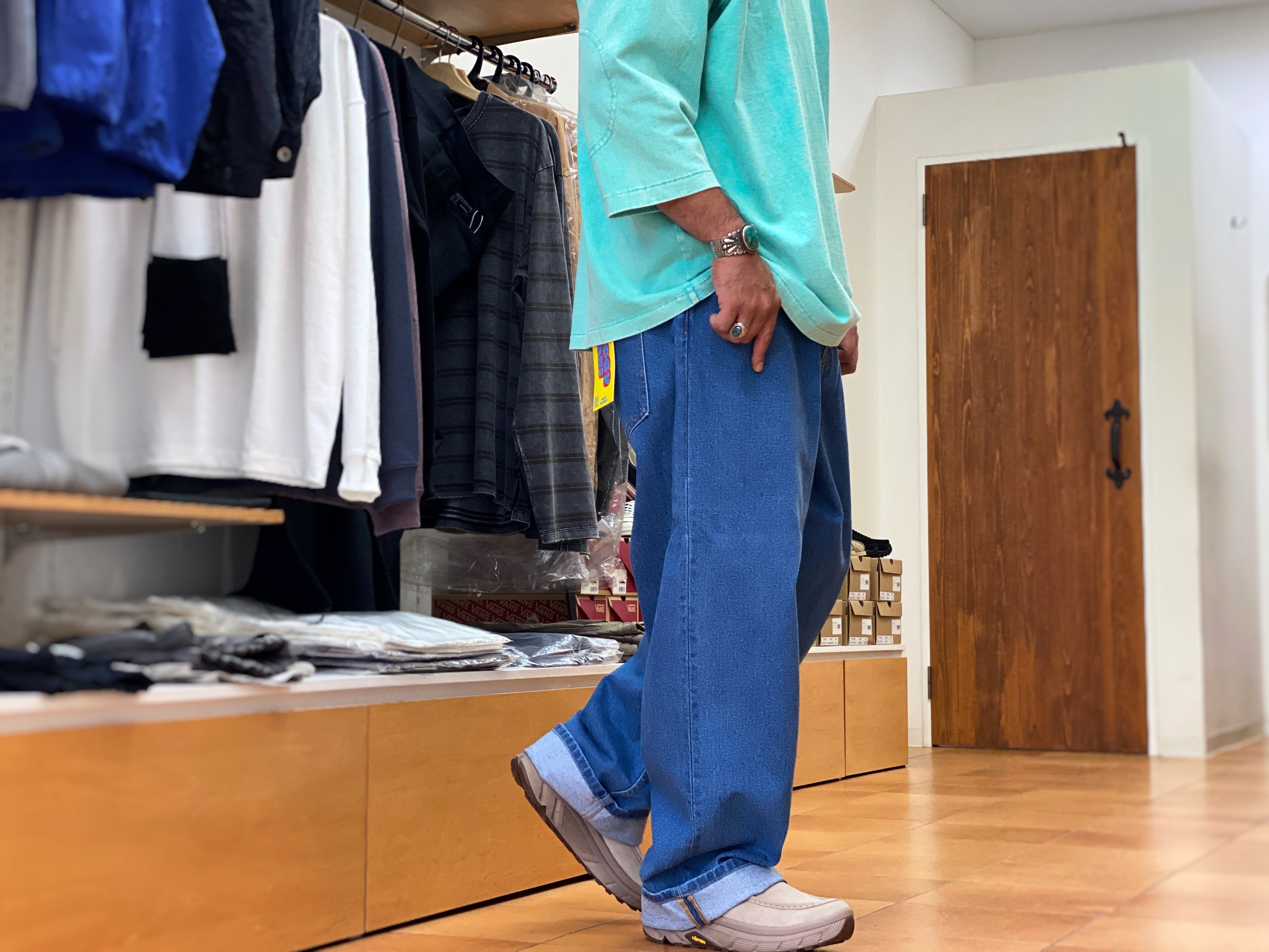 バギーシルエットのブルージーンズ。