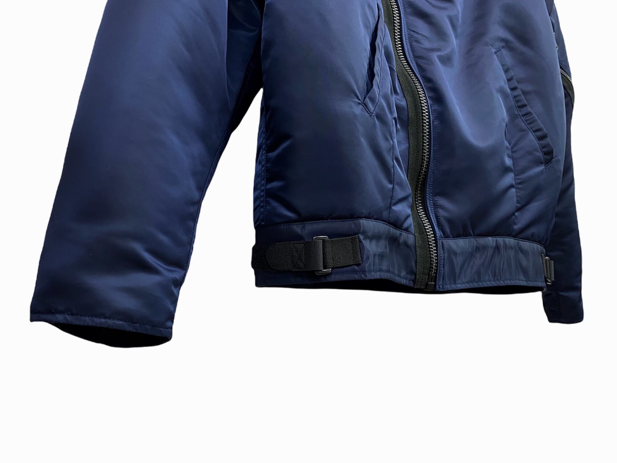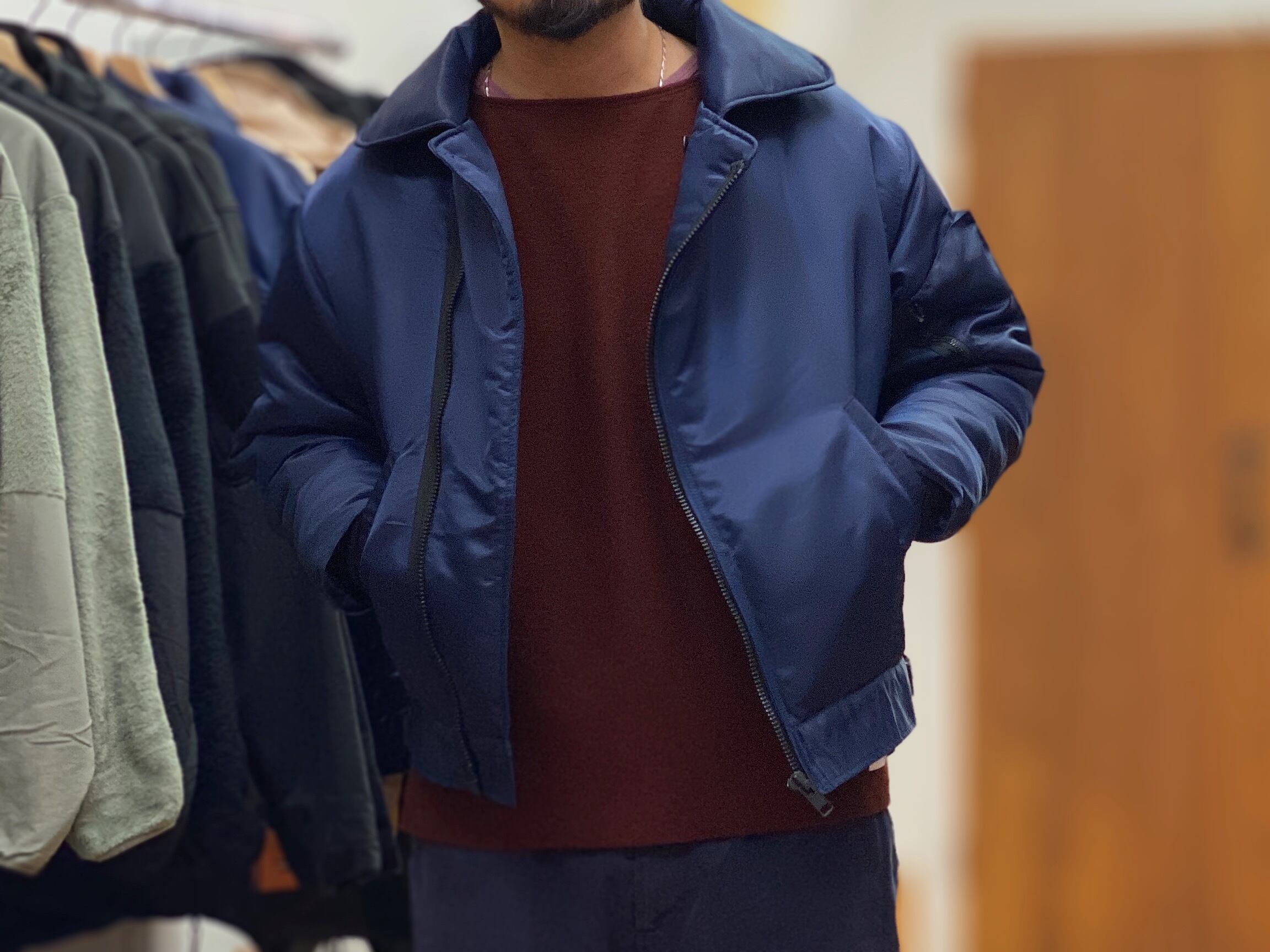 斜めに着いたジッパーに左袖のポケット。