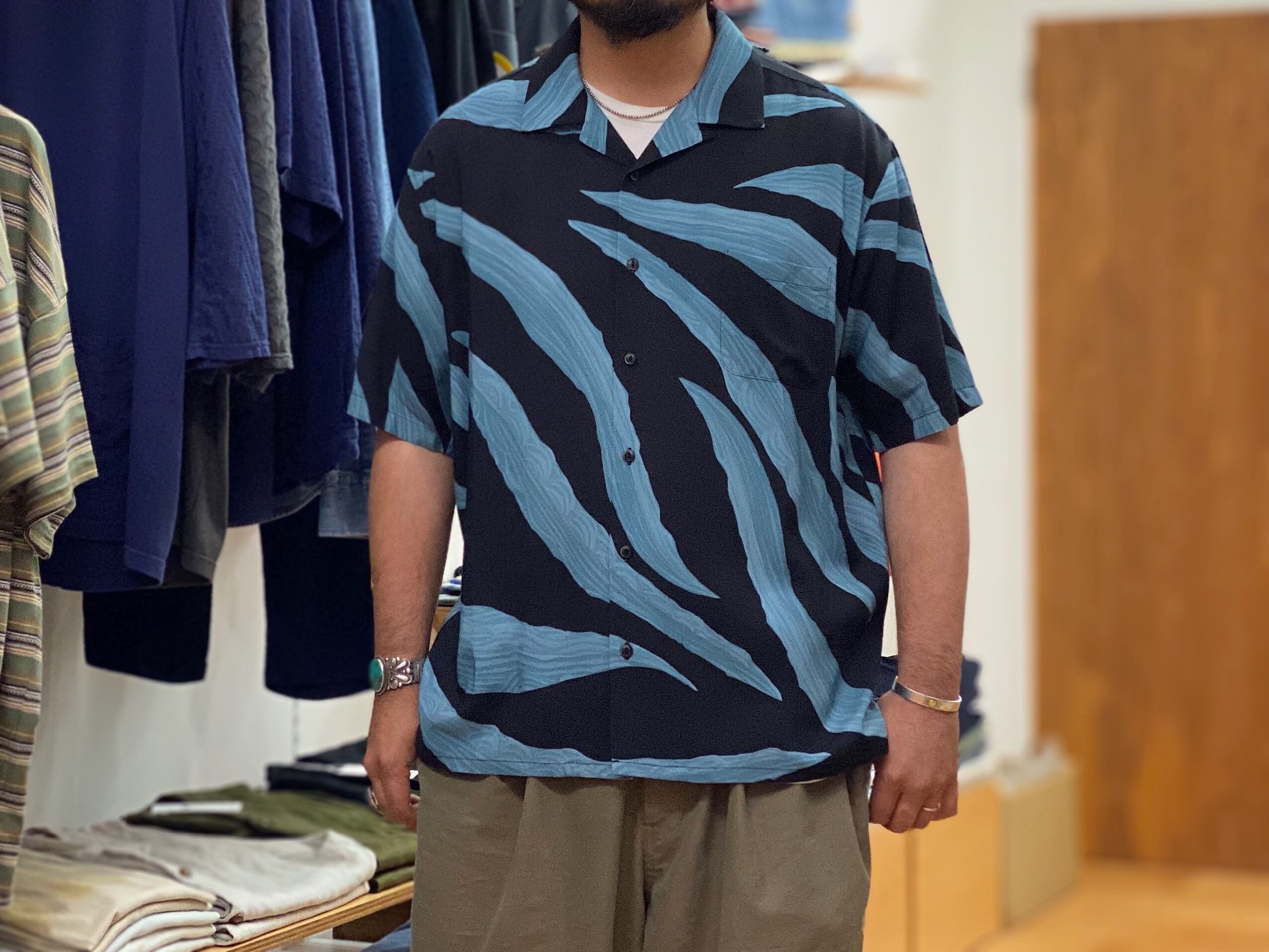 オープンカラーのレーヨンシャツ。