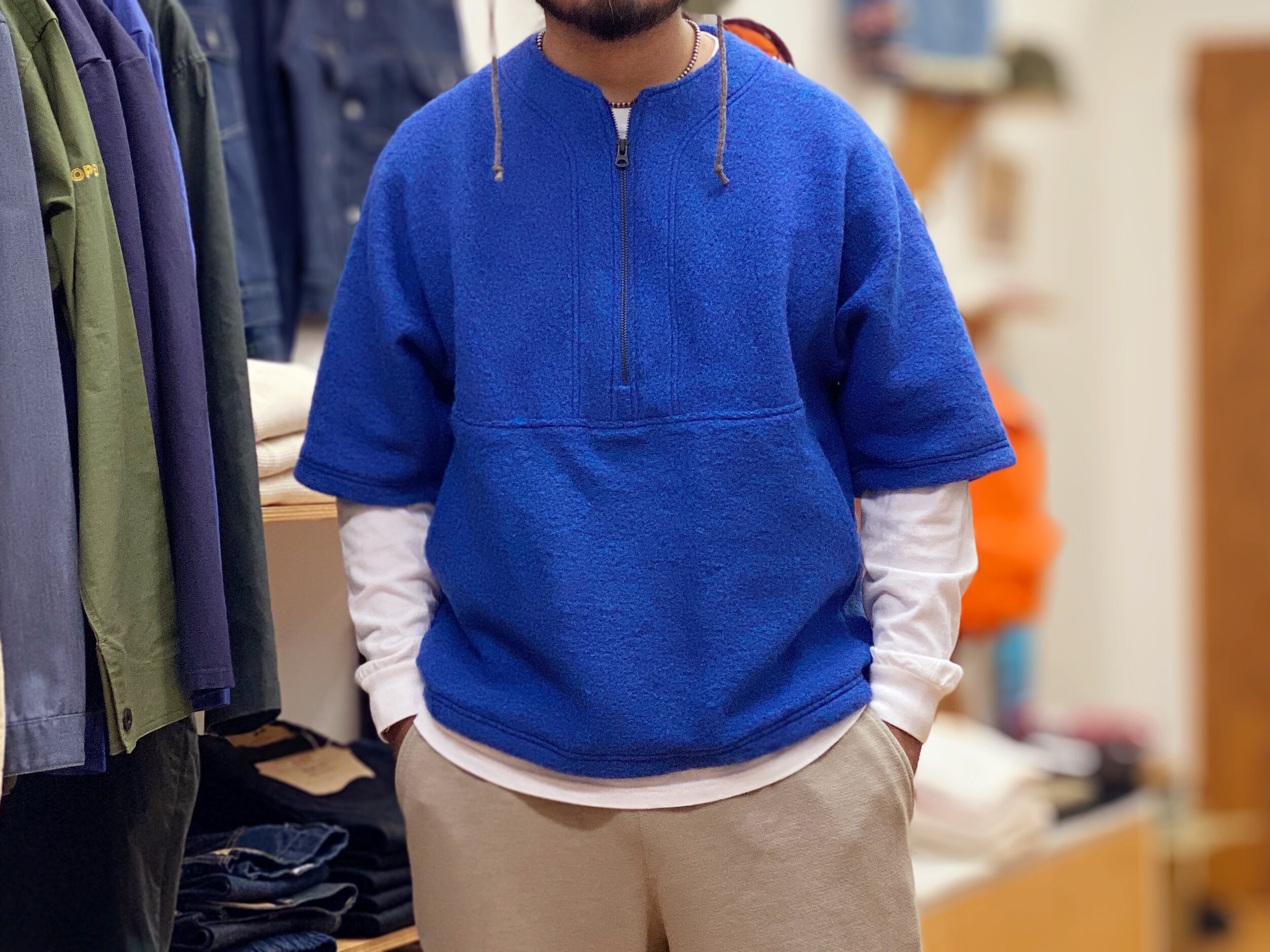ハーフジップの半袖のウールシャツって